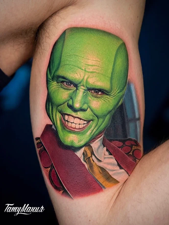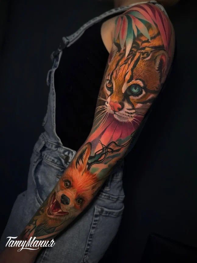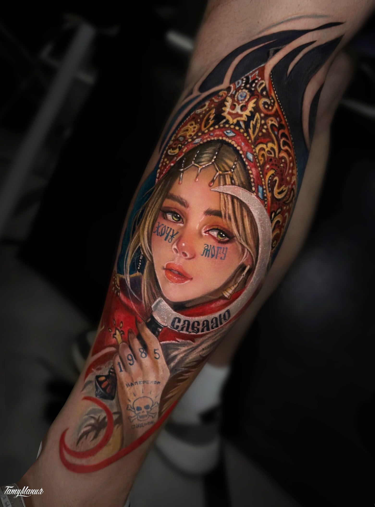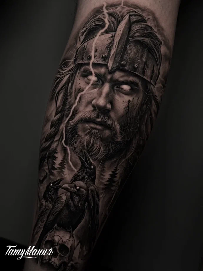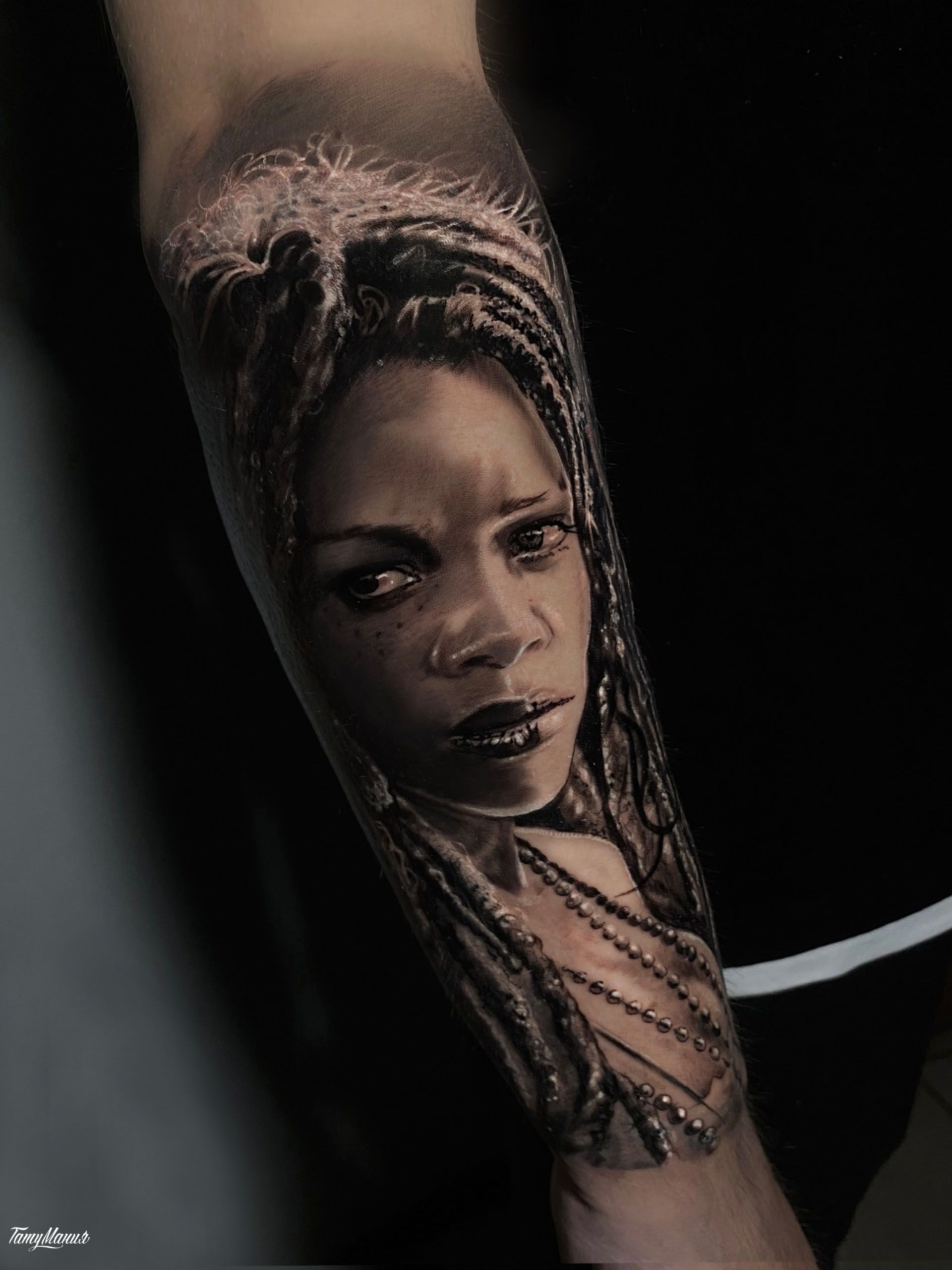 Портрет проработан с высокой степенью детализации — переданы мимические линии, текстура кожи и глубина взгляда; перья, складки одежды и фон выполнены фактурными штрихами и мягкой градацией серых тонов. Контрастные акценты ведут глаз по композиции, а тщательная адаптация под изгибы предплечья обеспечивает читаемость и цельность образа на всём протяжении рукава.