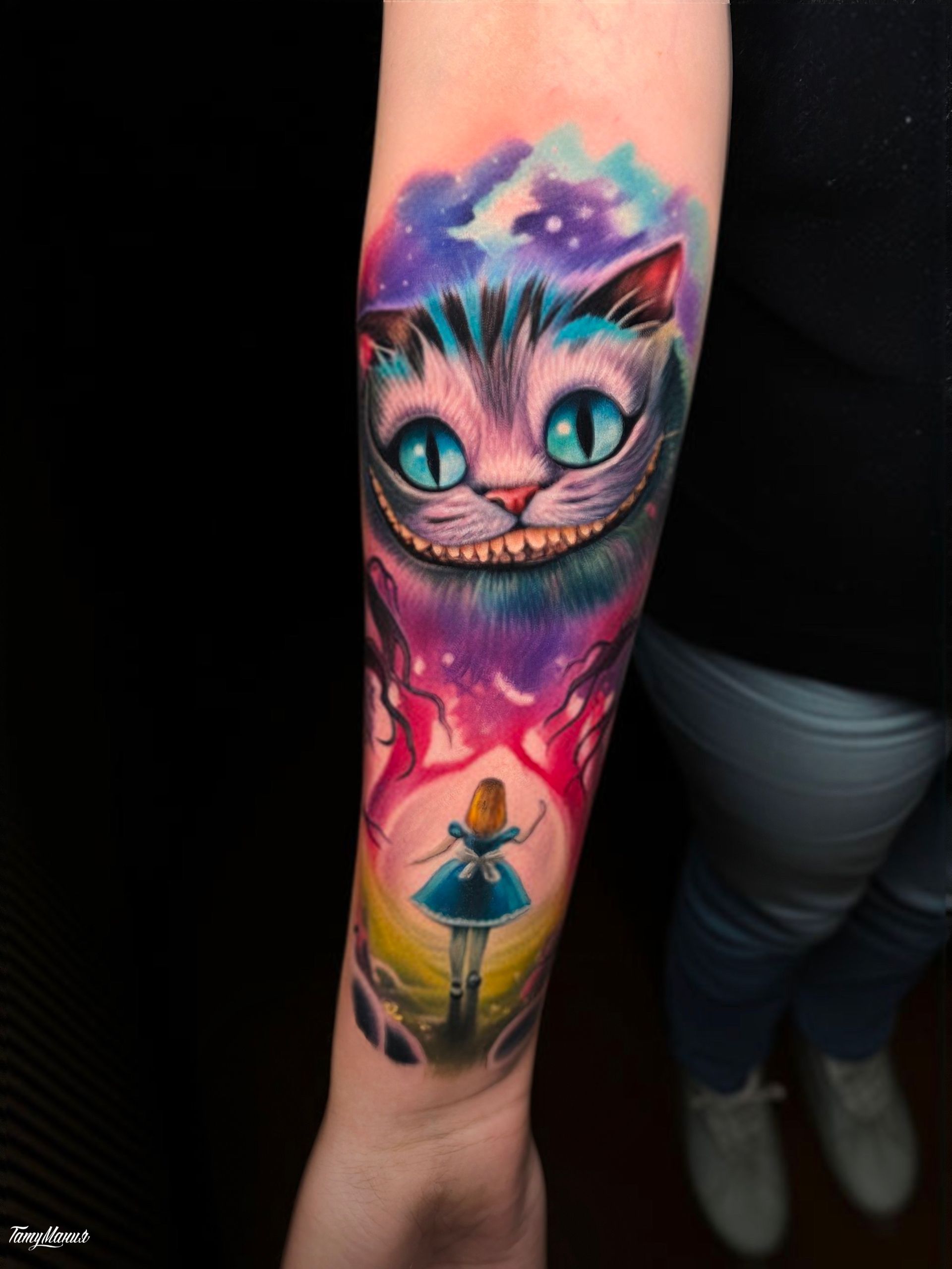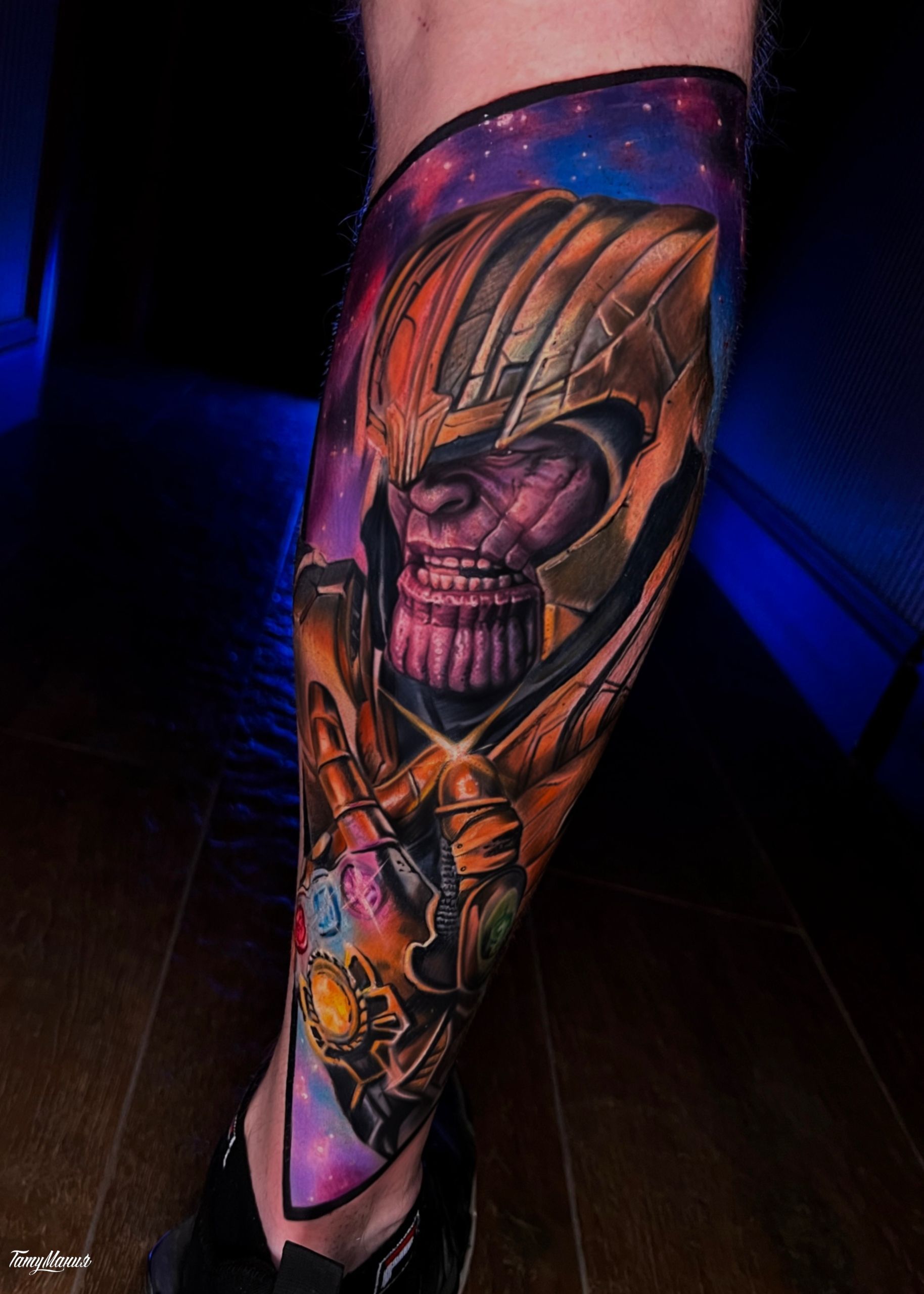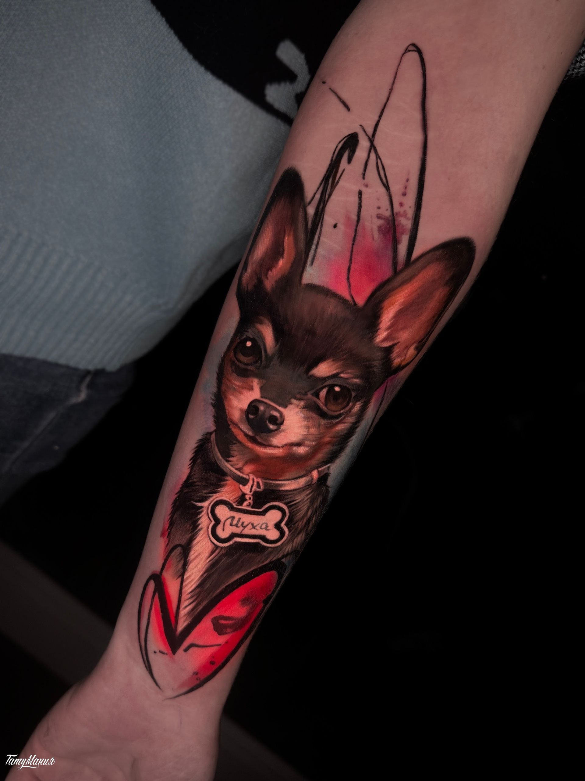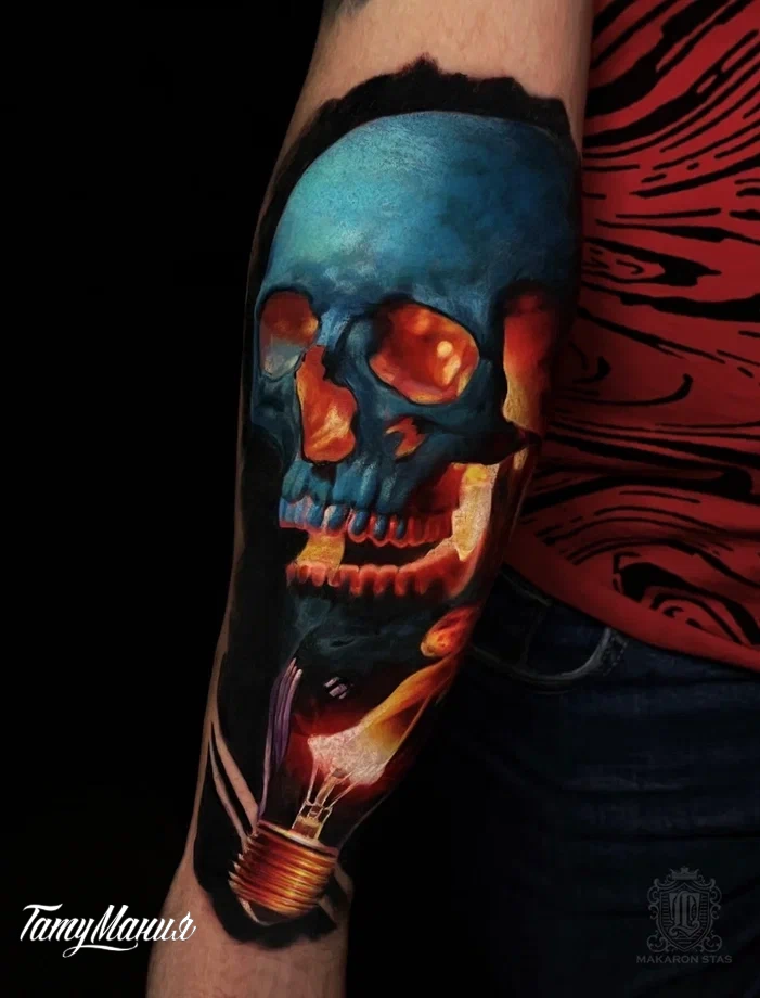 Портрет проработан с высокой степенью детализации — переданы мимические линии, текстура кожи и глубина взгляда; перья, складки одежды и фон выполнены фактурными штрихами и мягкой градацией серых тонов. Контрастные акценты ведут глаз по композиции, а тщательная адаптация под изгибы предплечья обеспечивает читаемость и цельность образа на всём протяжении рукава.