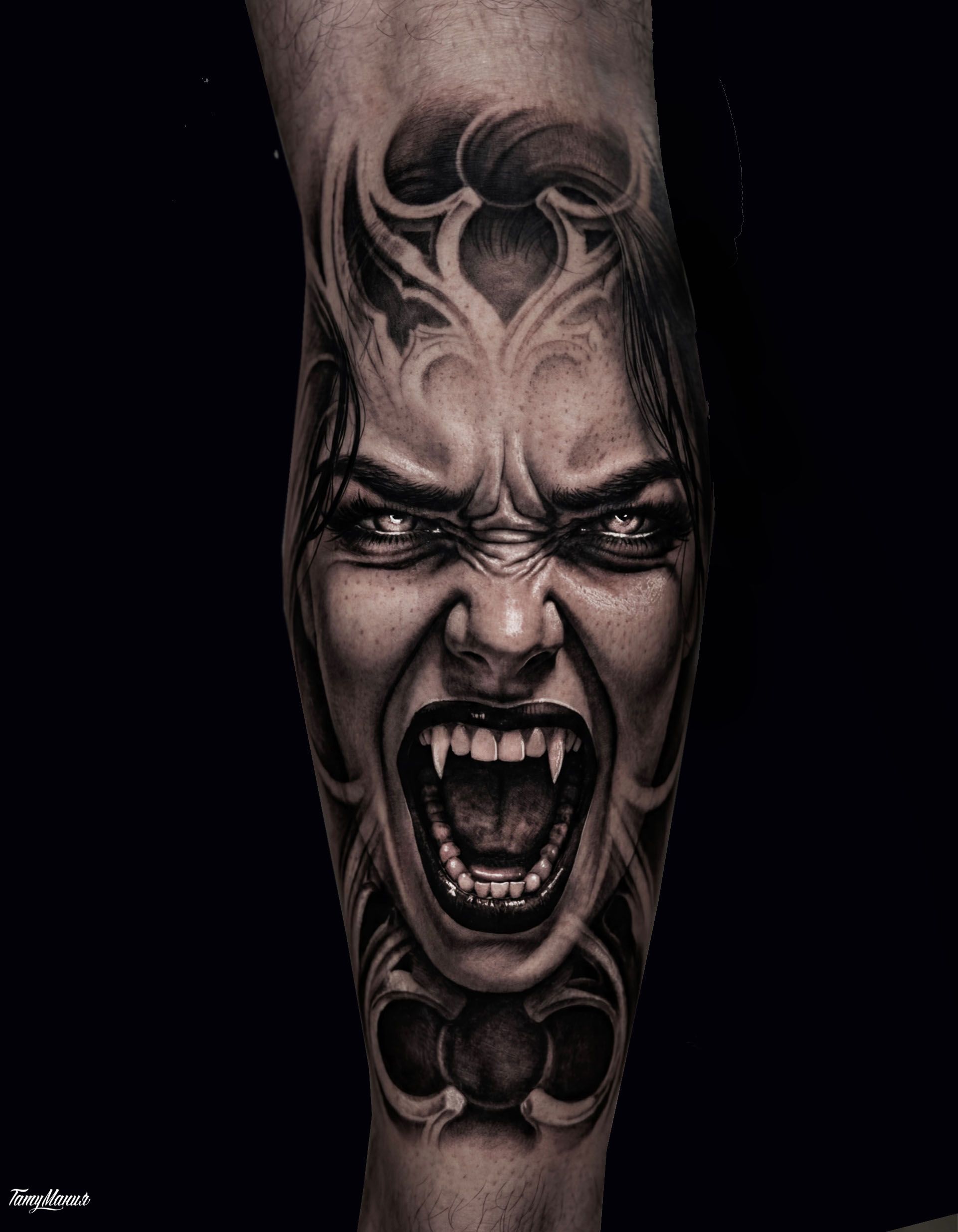 Полный рукав, в котором классический образ ангела плавно переходит в портретную композицию — крупная монохромная работа в реалистичной манере с приёмами, близкими к гравюре: тонкая штриховка, плотная растушёвка и выразительная игра светотени создают объём и драматизм. Чёрно‑белая палитра подчёркивает контраст и придаёт работе благородную строгость, а масштаб и расположение рассчитаны на мужскую анатомию руки, чтобы рисунок выглядел гармонично с любого ракурса.